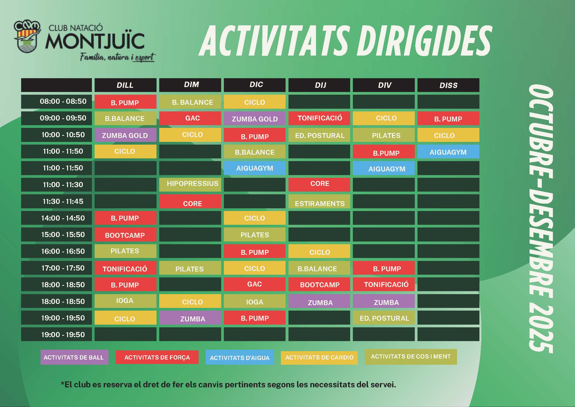 Inscriu-te com a Soci i gaudeix del nostre programa d’Activitats Dirigides sense cap cost adicional. Posa’t en forma, disfruta i diverteix-te fent esport, tonifica’t, balla, pedaletja o nada de la mà del nostre equip de monitors especialitzats, que t’ajudará a assolir els teus objectius aprofitant al màxim l’activitat.