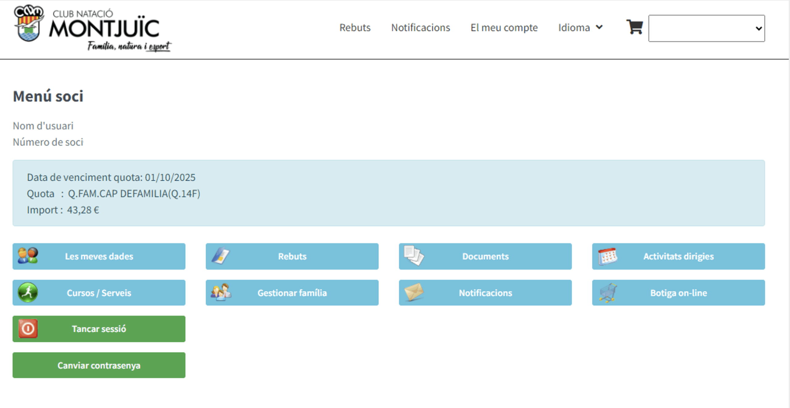 En aquesta nova àrea podreu accedir a les diferents àrees disponibles i també podreu gestionar el pagament de rebuts pendents i tenir la informació de la vostra quota i el pròxim venciment. En el cas de quotes familiars es podrà gestionar també inscripcions d’altres membres del grup familiar.